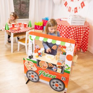 Get playtime cooking and take imaginations for a spin with all the essentials for a pretend play pizza food truck experience! The multi-sided. easy-to-assembly wooden structure. with a built-in pretend pizza oven and dozens of wooden and felt play food accessories. lets girls and boys ages three and older be the helpful food truck vendor or the hungry customer. Display choices on a magnetic menu board. add logs and turn the dial to fire up the pizza oven. sort and store pizza toppings in the prep tray. slide pizza into the oven with the wooden pizza paddle. then serve in the cardboard delivery box! Complete the meal with drink cans and scoop a wooden ice cream cup or cone for dessert! The pass-through window with awning. credit card machine and play bank card. spinning steering wheel. and flip-out gas cap add to the realistic fun. Great for imaginative. skill-building play — little pizza chefs will love using the pieces for counting. sorting. color recognition. and language development!