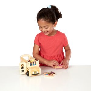 The school bus is here! There’s a friendly driver at the wheel and room for six happy passengers in this eight-piece wooden play set. With easy-rolling wheels and a door that opens and closes. this exciting set stars a timeless-favorite vehicle and includes all the solid-wood play figures kids need to fill the seats. Durable construction means the fun will go on through countless pickups and drop-offs!
