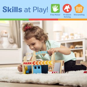This all-in-one service station is truly full service! Park the two included wooden cars in the parking garage with movable elevator or pull them through the car wash. Don’t forget to fill up at the gas pump before getting the cars serviced at the garage with sliding doors. This play set for ages 3+ encourages fine motor skills. hand-eye coordination. problem solving. and imaginative play. The built-in handle makes it the perfect take-along toy!