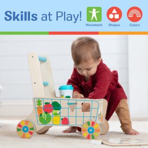 This cheery and sturdy wooden grocery cart is filled with fun skill-building activities! Very young kids can sort colorful chunky wooden food shapes through holes in the sides of the cart. and place them in two wooden puzzle boards that store in the cart. Spin the built-in roller drum for sensory stimulation and matching games. and enhance imitative pretend play with a realistic coffee cup with removable lid that fits in a cup holder in the cart! As kids grow. using the cart as a push toy helps build motor skills and inspire imaginative play. A great way to encourage kids 12 months and older to explore problem-solving and cause-and-effect. Assembled cart measures 15.5 inches tall. 10.75 inches wide. 15 inches long (39.4 cm x 27.3 cm x 38 cm). Melissa & Doug infant and toddler toys inspire a-ha! moments of discovery. Adorable. diverse characters and a variety of fun shapes and textures encourage exploratory. skill-building play.