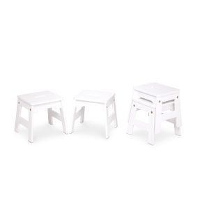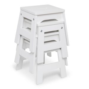 Have a seat (or four)! This set of four sturdy wooden stools is perfect for use around an activity or play table and makes a great addition to any kid’s play space. Available in white. natural (light woodgrain). and two-tone white and natural. the 11-inch-high stools wipe clean with just a damp cloth and fit any home decor. A cutout handle in the seat makes these easy to carry from room to room. and they are designed to stack for convenient storage. Stools are sized for kids three to eight years old. up to 100 pounds.