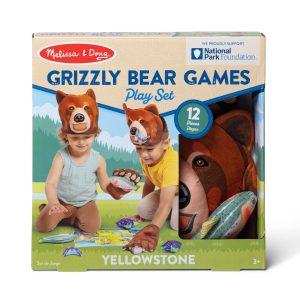Discover the wonder of Yellowstone National Park and learn about grizzly bears through play! Play catching games with two bear paw gloves with self-stick hook-and-loop tabs. Plush fish. moths. and berries — some of grizzlies’ favorite snacks — also stick to the snouts of two plush strap-on grizzly bear heads for hands-free pick-up games and exciting role playing. The play set is a fun and educational introduction to the country’s national parks for kids three and older. It includes a double-sided. full-color activity guide with a simple map of Yellowstone for pretend play. game ideas. and fun facts about grizzly bears in English and Spanish. Melissa & Doug® is proud to support the National Park Foundation with a million-dollar minimum donation over three years. The Melissa & Doug® National Park Foundation collection is designed to inspire kids to discover the wonder of America’s national parks. Together. we’re helping protect our parks for present and future generations!